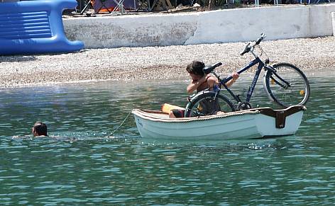 Eine der Möglichkeit, in einer Ankerbucht ein Fahrrad vom Schiff ans Land zu befördern .... | |