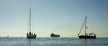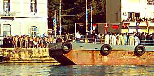 Die Steigerung davon dann im großen Hafen, wo hunderte (oder tausende) von Menschen sich am Pier drängten. Kaum kamen wir in Sicht, drehten sich die erwartungsvoll auf die geistliche Plattform gerichteten Blicke in unsere Richtung, Fotoapparate schossen aus den Taschen, es wurde begeistert gestikuliert. Neben all den Yachten und Fischerbooten waren wir (zwei Kanufahrer ausgenommen) mit Abstand das kleinste Boot. Nach kurzer Wartezeit war dann die Blaskapelle zu hören, und versteckt zwischen der Menschenmenge bewegte sich ganz langsam der Festzug - von uns nur an der wandernden Fahne erkennbar. Es folgten einige Trommelwirbeln und Fanfarenstöße, die Geistlichen gingen an Bord. |