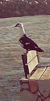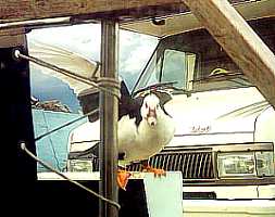 Die kleinere der Beiden läßt sich von Pia keinen Zentimeter von ihrem Platz vertreiben. Sie dreht nur ganz lässig den Kopf und faucht sie mit dem Schnabel an. Ich taufe sie "Eiserne Emma". Die Größere sitzt am liebsten wie eine Möve auf einer Banklehne oder einem Elektrokasten. Ich taufe sie ebenfalls: "Fröhliche Fanny". |