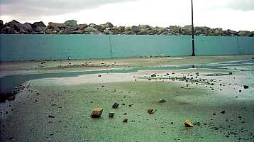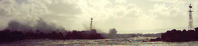 Blick vom Hafencafe auf's Meer. Die Welle kommt ...... und am Pier wird's nass |