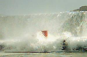 Abgesehen davon, dass man sich wasserdicht anziehen mußte, wenn man über die Gangway ans Pier wollte, gab's zwei Dinge zu beachten: Einen Augenblick wählen, wo gerade keine Wassermassen über die Mauer klatschen (man hört die Wellen anrollen) und außerdem noch einen Moment erwischen, in dem das Schiff nicht hüpft wie ein durchgedrehtes Karnickel. Letztes Jahr hat es einen 100 kg schweren Segler kurzerhand ins Hafenbecken gespült (da der Wasserstand im Hafen teilweise höher war als das Pier wälzte er sich wieder auf den Beton zurück ). |