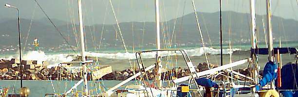| Die vergangenen zwei Tage pfiff ein gehöriger Südwind, der eine Welle mit sich brachte, wie wir sie im Hafen von Kalamata noch nicht erlebt hatten. Trockenen Hauptes von Bord oder zurück zu kommen war fast unmöglich, die Schritte über die Gangway bedeuteten jedesmal ein mittleres Abenteuer. | ||