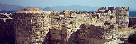 Medieval Castle - die mittelalterliche, venezianische Festung der Ritter des Johanniterordens aus dem 15. Jh. Mit all ihren Zinnen und Schießscharten gleicht sie einem riesigen Schutzwall vor dem Hafen und läßt nur eine Einfahrt für kleine Schiffe frei. Die großen Fähren machen an der Mole am Außenpier fest. Die Festung mit ihrer doppelten Mauer und dem Graben wurde im 15. Jh. mit Trümmern der antiken Stadt erbaut, die durch ein Erdbeben zerstört worden war. Von außen kann man in der Mauer deutlich die Reste der antiken Säulen sehen.