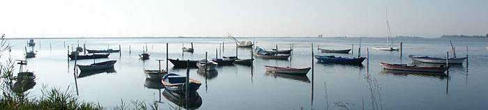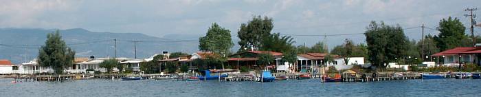 | Durch den Kanal geht es zum Hafen nach Messolongi. Wir beobachten wieder einmal konzentriert den Tiefenmesser, doch diesmal scheint die Fahrrinne gut ausgebaggert zu sein. Rechts und links dem Kanal entlang stehen unzählige kleine Häuschen auf Holzpfählen, natürlich mit den dazugehörigen Fischerbötchen. | ||