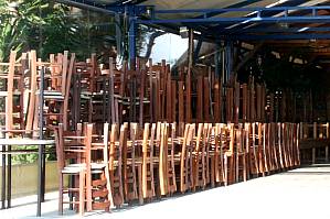 | Tische und Stühle sind gestapelt,