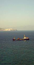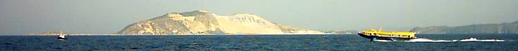 | 7 Uhr früh: "Mir hän' zahlt" murmelt Thomas im Halbschlaf als ich ihn wecke. Er ist im Traum noch in Kos, doch der Traum verblaßt sehr schnell und er kriecht aus der Koje. Ein Mann hatte freundlich an unser Schiff geklopft und uns mitgeteilt, daß gleich die kleine Fähre mit den Arbeitern des Zementwerkes anlegen wird. So laufen wir also aus. Es ist nur ein Katzensprung zur Insel Nisyros in den Hafen Mandraki, gerade recht, um die erste Tasse Grüntee zu trinken. | ||