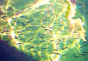 Blick vom Schiff auf den Hafengrund: an der Wasseroberfläche brechen sich die Sonnenstrahlen und ergeben am Sandgrund faszinierende Muster |