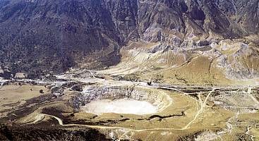 Einer der drei Krater des Vulkans: Durchmesser 260 m, Tiefe 30 Meter. Man kann auf einer Seite hinuntersteigen. Die Kratersohle ist warm, aus verschiedenen Öffnungen steigen Wasser- und Schwefeldämpfe auf. Die ganze Umgebung gleicht einer Mondlandschaft. |