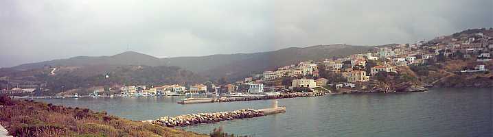 Kurz vor dem Ablegen bekommen wir von zwei Einheimischen noch wettermäßig die Versicherung: "No problem to go to Chios". Auch im griechischen Wetterdienst Poseidon schaut es friedlich aus. Doch kaum sind wir aus der Bucht heraus, frischt der Wind auf und die Welle nimmt rasant zu. Zwei Stunden ungemütliche Starkwindfahrt - dann sind wir im Haupthafen von Chios. | ||