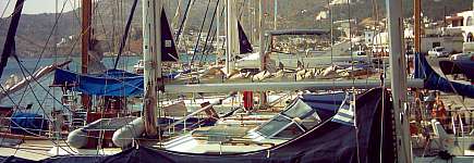 wir im Hafen von Patmos ankommen ist jede Menge Platz - wir wundern uns, weshalb uns österreichische Segler an der Hafeneinfahrt unter Vollgas überholen mußten (und dann über eine Stunde brauchten, bis sie endlich angelegt hatten). Bis zum Abend jedoch ändert sich die Situation - jede Lücke ist gefüllt. |