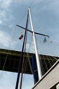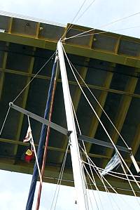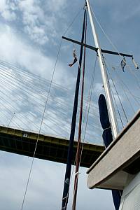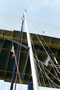 | Es sieht schon etwas unheimlich aus, unter der riesigen Brücke durchzufahren. Auch wenn man die Maße kennt - ich halte immer noch den Atem an, bis der Mast "endlich" auf der anderen Seite ist. | ||