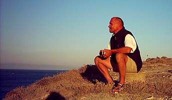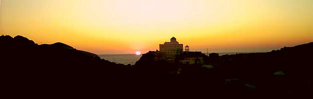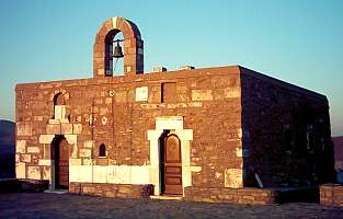 | Wir bedanken uns herzlich bei der freundlichen jungen Frau und setzen uns vor der Kapelle auf eine Mauer, um den Sonnenuntergang zu sehen. Da kommt sie mit einem kleinen Karton und bietet jedem von uns eine griechische Süßigkeit an - in Puderzucker gewälzte Fruchtgeleestücke. Wir bedanken uns nochmals wärmstens und versinken für den Rest des Abend entgültig in griechisch-romantischer Sonnenuntergangsstimmung. | ||