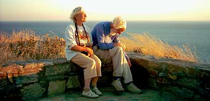 Die kleine Insel strahlt einen ganz eigenen Charme aus. Wie in den meisten Städten Griechenlands ist auch hier am Abend "flanieren" angesagt. Doch es scheint hier ruhiger, ungezwungener, familiärer. Man wandert das Pier auf und ab, Mamis schieben die Kinderwägen vor sich her und unterhalten sich angeregt mit den Freundinnen, Mädchen- und Jungengruppen tasten sich aneinander heran, die Kinder spielen Fangen oder Fußball, die älteren Herren sitzen an ihren Stammtischen in der Taverna und diskutieren temperamentvoll und gestenreich mit dem alten, weißbärtigen Dorfpopen. |