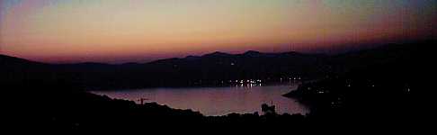 | In der Taverna am Strand sind alle Tische festlich gedeckt, die Kellner laufen eifrig herum, rücken die Servietten zurecht und sichern die Tischdecken gegen den Wind. Im Schatten unter den Bäumen sammelt sich die Musikergruppe und wir bekommen an diesem Abend endlich einmal kein Disco-Gedröhne sondern wirklich schön gespielte griechische Musik. Wir sitzen bis spät in die Nacht noch auf der Heckterrasse und genießen den Abendwind, die angenehme Kühle nach dem heißen Tag, die Klänge, die vom Ufer zu uns herüberkommen. Hinter dem Berg qualmt es immer noch. | ||
