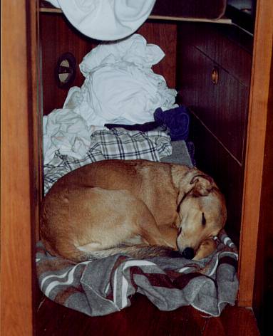 Von all den blinkenden, kunterbunten Lichterketten, die zwei junge Marina-Angestellte am Tag vorher stundenlang um Palmen, Büsche und Laternenpfähle andächtig arrangiert haben, ist nichts mehr zu sehen. Stromausfall. Also machen wir einen Lesetag und finden es ganz gemütlich. Die Unity liegt sicher vertäut, allerdings schwankt das Schiff gewaltig hin und her. Pia hat sich in den hintersten Winkel des Schiffs verzogen, den Kopf zwischen die Hinterläufe gesteckt und stellt sich tot. Diagnose: Seekrankheit. Alle paar Stunden kriecht sie aus ihrer Höhle, schaut kurz zum Fenster hinaus, zieht den Schwanz ein und verschwindet umgehend wieder in ihr „Katastrophen-Lager“. Den ganzen Sommer über war der Hund nicht seekrank, aber jetzt im Hafen liegt er da wie ein Schluck Wasser. |
