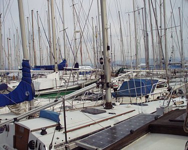 | Am nächsten Abend (wieder Flucht vor DiscoMusik) im selben Hafen trafen wir einen „alten Bekannten“: Einen Steinmetz aus dem Rheinland, den wir letztes Jahr in Paxoi (Gaios) kennen gelernt hatten (hat sich eine Reincke-AluYacht selbst gebaut). Er erzählte uns, dass er eines Abends über den Steg zurück zu seinem Schiff ging, als er aus dem Wasser laute Hilfeschreie hörte. Eben dieser John vom Vorabend war sturzbetrunken mit dem Fahrrad ins Wasser gefahren…- und konnte nicht schwimmen! John wurde also herausgefischt, am nächsten Morgen tauchte man nach dem Fahrrad. | |