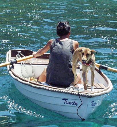 Vorderfüße auf dem Boot, Hinterfüße auf dem Stein - das Dingi trieb