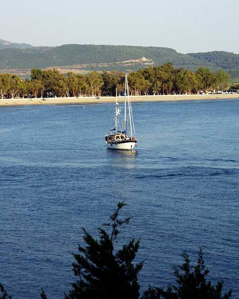 Charterer waren abends in den kleinen Fischereihafen von Petriti gekommen und wollten, wie es hier üblich, ist mit dem Heck am Kai anlegen. Wind 4-5, schräg von vorne auf die Hafenmauer zu. Wir halfen vom Land aus zusammen mit ein paar anderen Seglern, das Schiff in die Lücke zu bugsieren. Zuerst hingen sie schräg zwischen den anderen Booten wie ein Schluck Wasser, allmählich bekamen wir sie gerade gerichtet. Es war schon dunkel, nur der Mond leuchtete und die Tavernen auf der anderen Seite des Hafens warfen etwas Licht herüber. Auf meine Frage, wieso um Himmelswillen sie